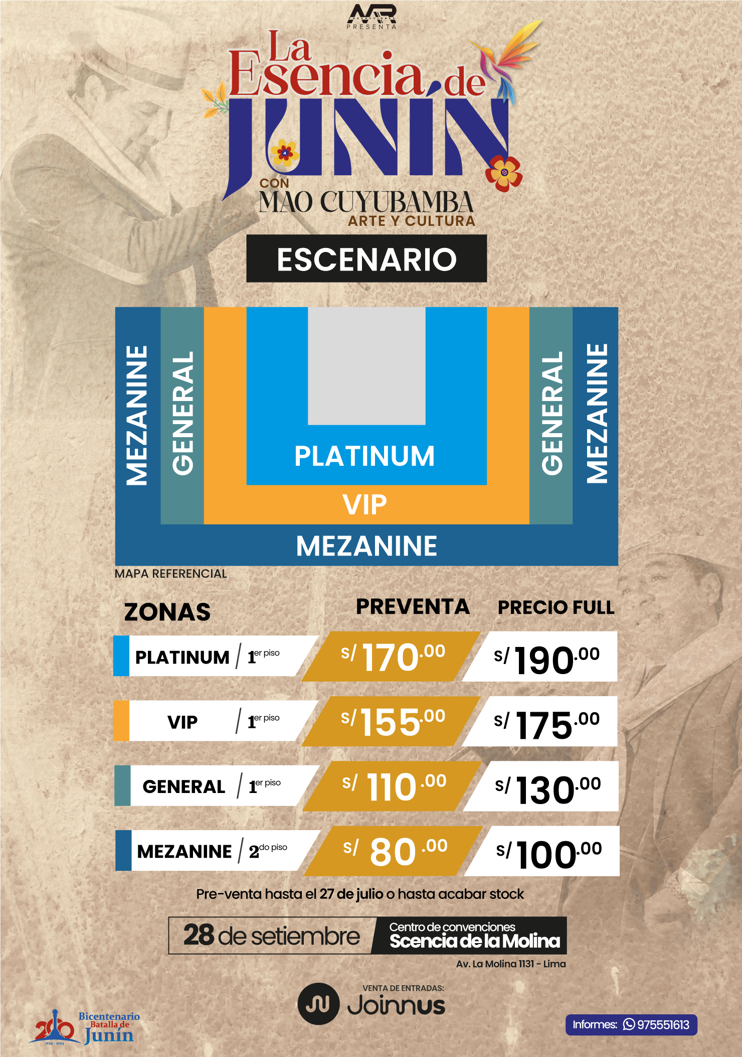 En el año del Bicentenario de la batalla de Junín; MYR Producciones presenta un espectáculo de lujo; "LA ESENCIA DE JUNIN CON MAO CUYUBAMBA". Arte y cultura en el mejor escenario; el centro de convenciones Scencia de La Molina; que brillará con la puesta en escena del arte y cultura de Junín.